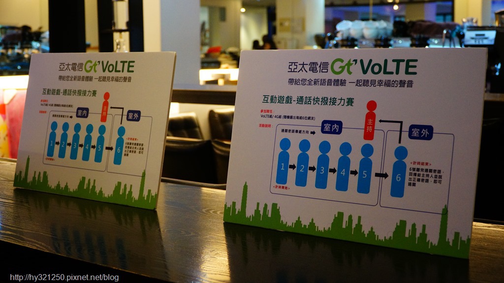 體驗時間節後,現場利用VoLTE語音電話撥打快速與通話音質清晰的特性,玩了一個4G組與VoLTE組通話快撥接力賽的互動遊戲。至於遊戲規則,是兩組各找6位參加體驗會的大大,4G組使用自己的手機,VoLTE組使用現場的VoLTE手機,然後前五棒依序撥打電話給下一棒,當下一棒聽到電話鈴聲後,才能繼續撥打電話給後一棒,等到第五棒要撥給在戶外等候的最後一棒時,主持人會提供他通關密語,且現場會開始有高分貝噪音干擾,最後第六棒接通電話並聽完通關密語後,再回到室內告訴主持人正確的通關密語,看看需要花費多少時間?