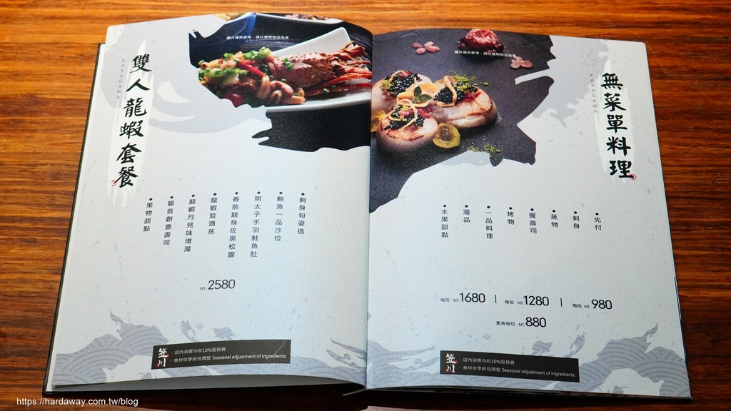 笠川無菜單懷石料理用餐現在是採線上點餐方式,不過這裡還是有提供實體菜單,讓客人在正式點餐前可以翻閱參考。