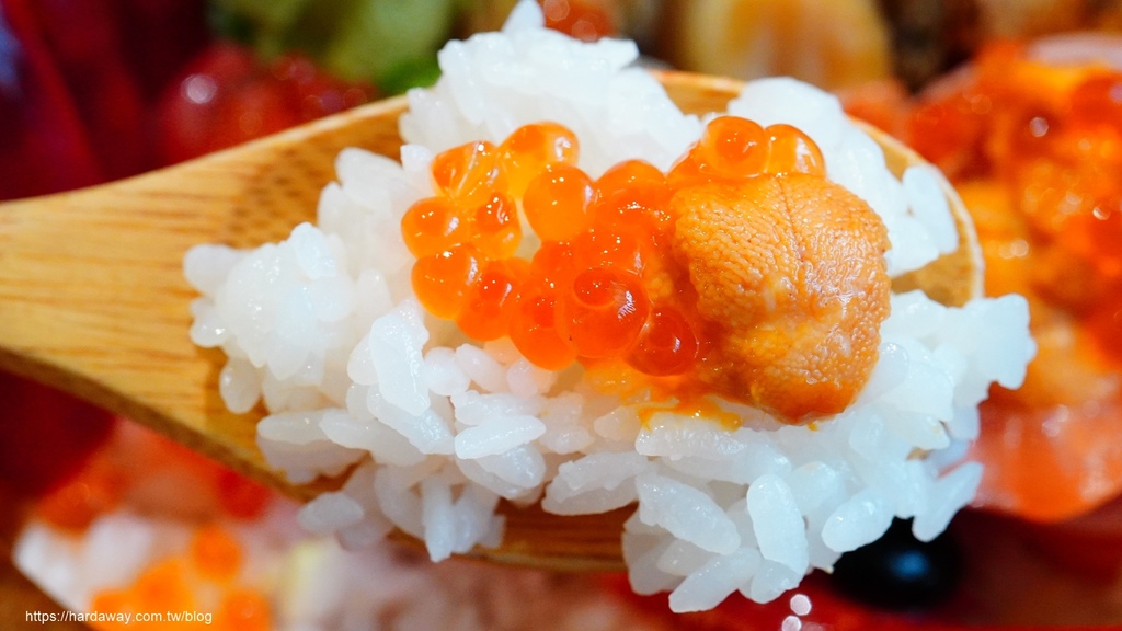 正式享用這碗丼飯,首先就挖些醋飯,然後放上鮭魚卵跟海膽,而吃進嘴裡之後,除了有三種食材各自不同口感外,當然嘴裡也會有著滿滿地鮮美海味說…
