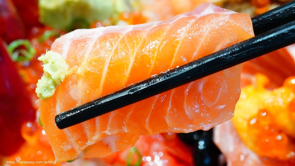 丼飯裡的鮭魚生魚片我也很喜歡,除了個頭大之外,在嘴裡咀嚼時也可以感受到油脂豐富說…