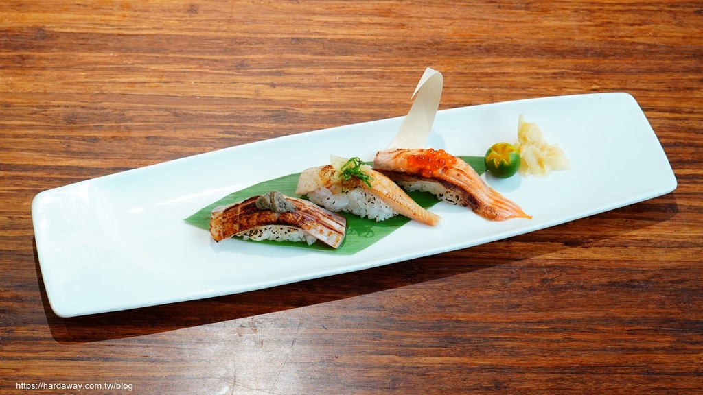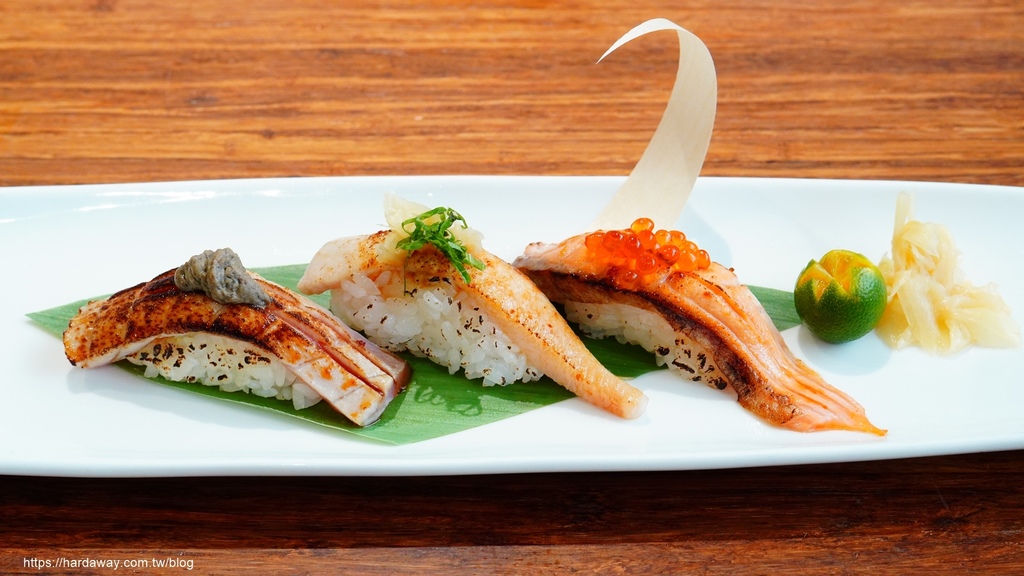 當天這盤綜合炙壽司裡的三貫握壽司,包含有炙燒鮪魚握壽司、炙燒鰤魚握壽司跟炙燒鮭魚握壽司。