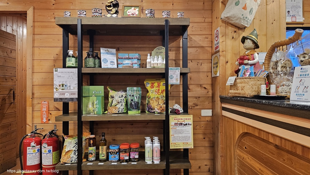 櫃臺一隅,還有旁邊的架子上,有陳列在地農特產品跟保養品,讓住宿的客人自由選購。