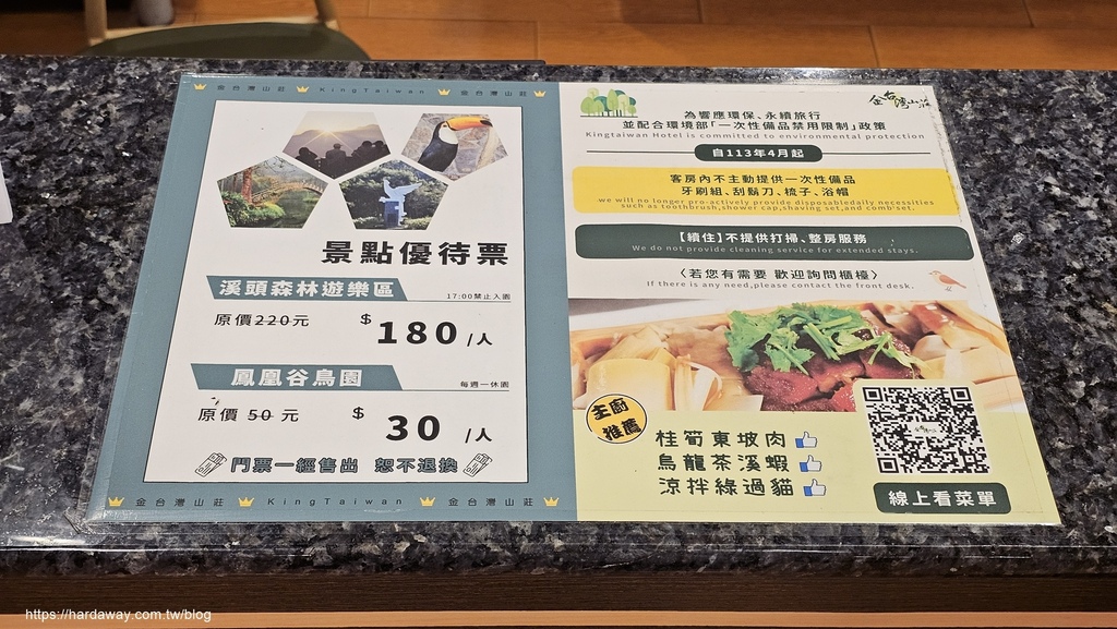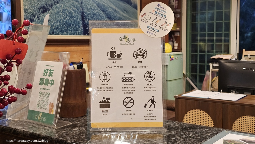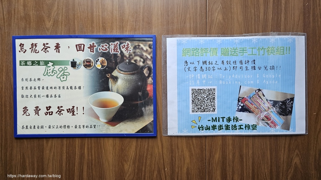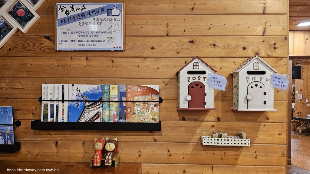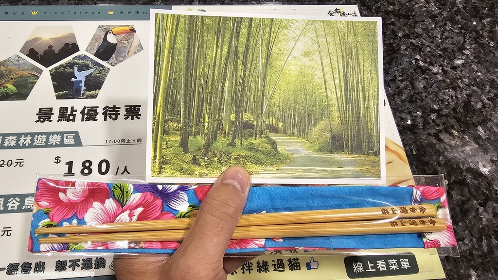 對了,這次住宿金台灣山莊民宿過程中,還看到兩個免費活動,第一個是FB打卡按讚送明信片,還能免費幫你寄回家,而另一個則是在指定網站分享住宿心得,讓櫃臺服務人員確認後就送手工竹筷組。