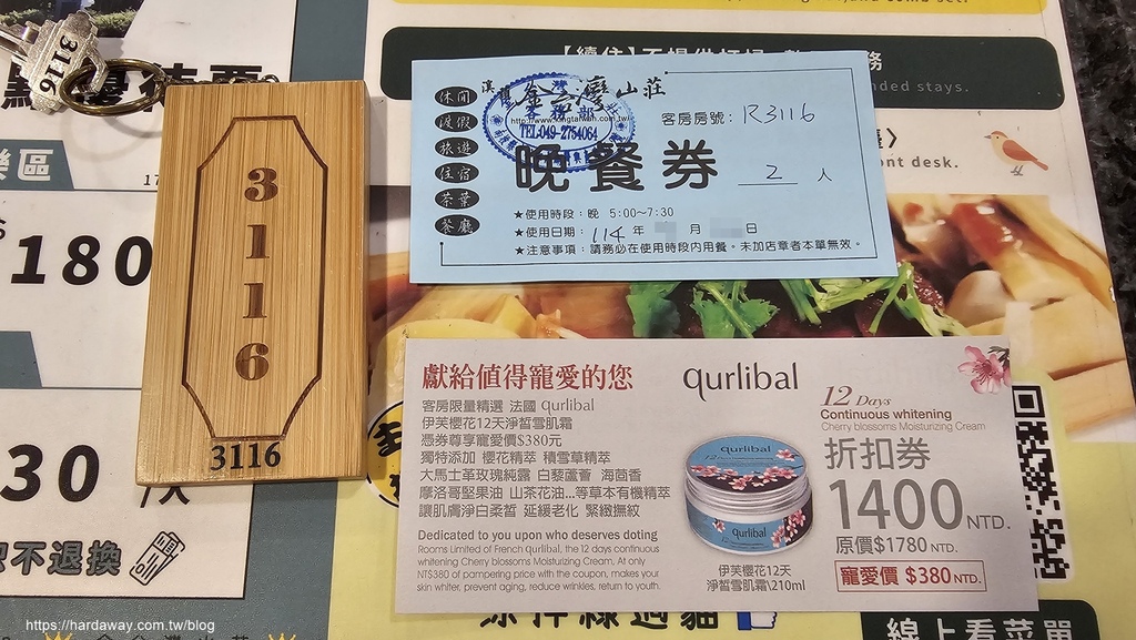 這次住宿金台灣山莊民宿是一泊二食方案,所以完成check in後,就拿到房間鑰匙、晚餐券跟一張商品折扣券。