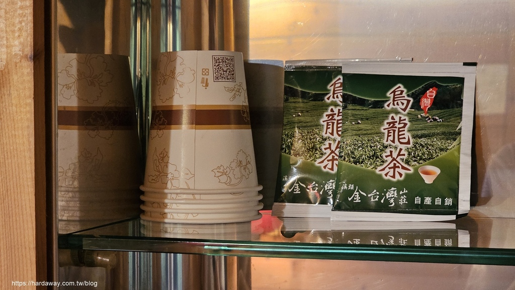 擺放在飲水機這裡的烏龍茶包,是金台灣山莊的自家產品。