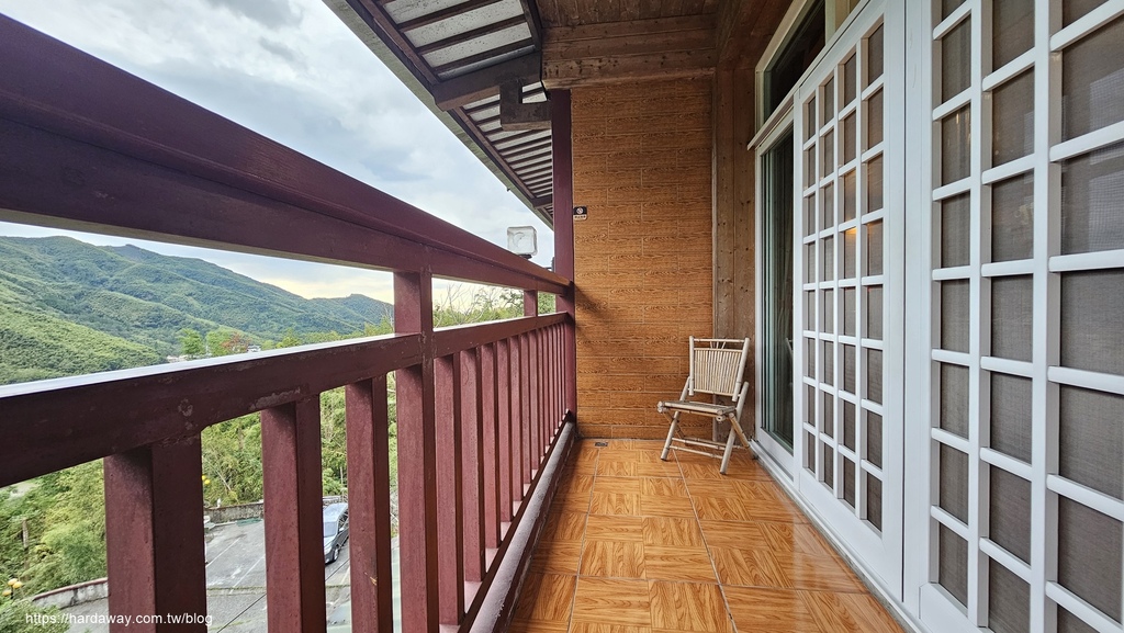 這間原木景觀雙人房有陽台,可以坐著欣賞遠方山景,還有民宿本身的庭園。