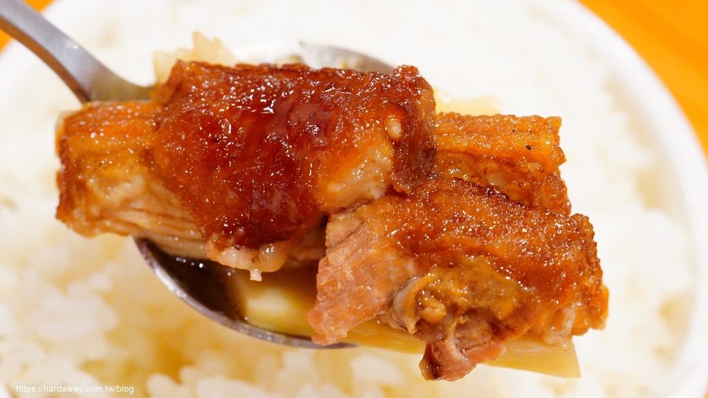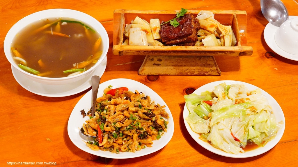 這三菜一湯中,我個人最喜歡桂筍東坡肉,因為東坡肉的肥肉外皮吃起來帶點酥脆感,而瘦肉部分則帶有嚼感,並且有蠻多肉汁的,搭配切大塊,然後口感爽脆中帶點舒服酸味的桂竹筍,真的是蠻下飯的一道菜。