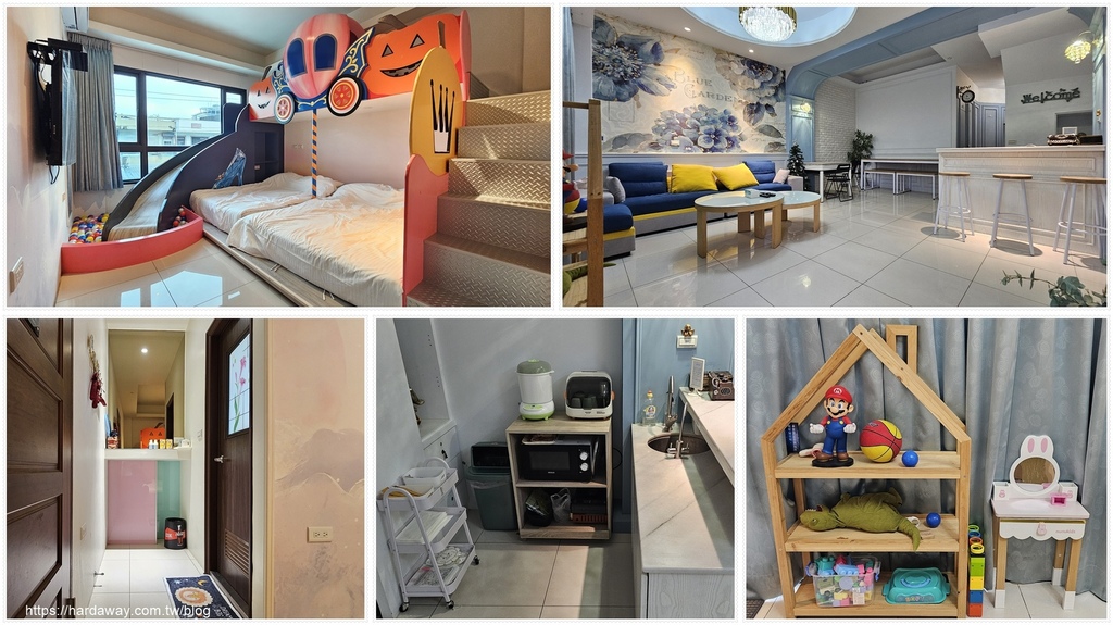 房間部分,金朵民宿總共有四個房間,都是四人房,而我們這次住的是南瓜馬車房,而一進房就看到相關布置跟溜滑梯。